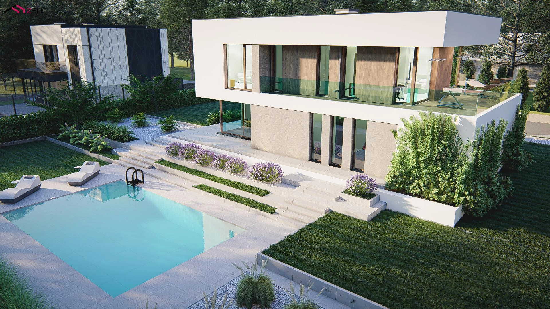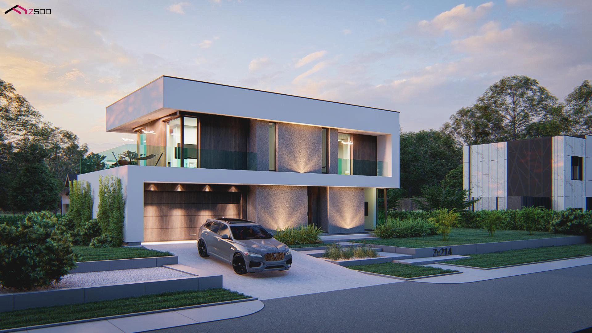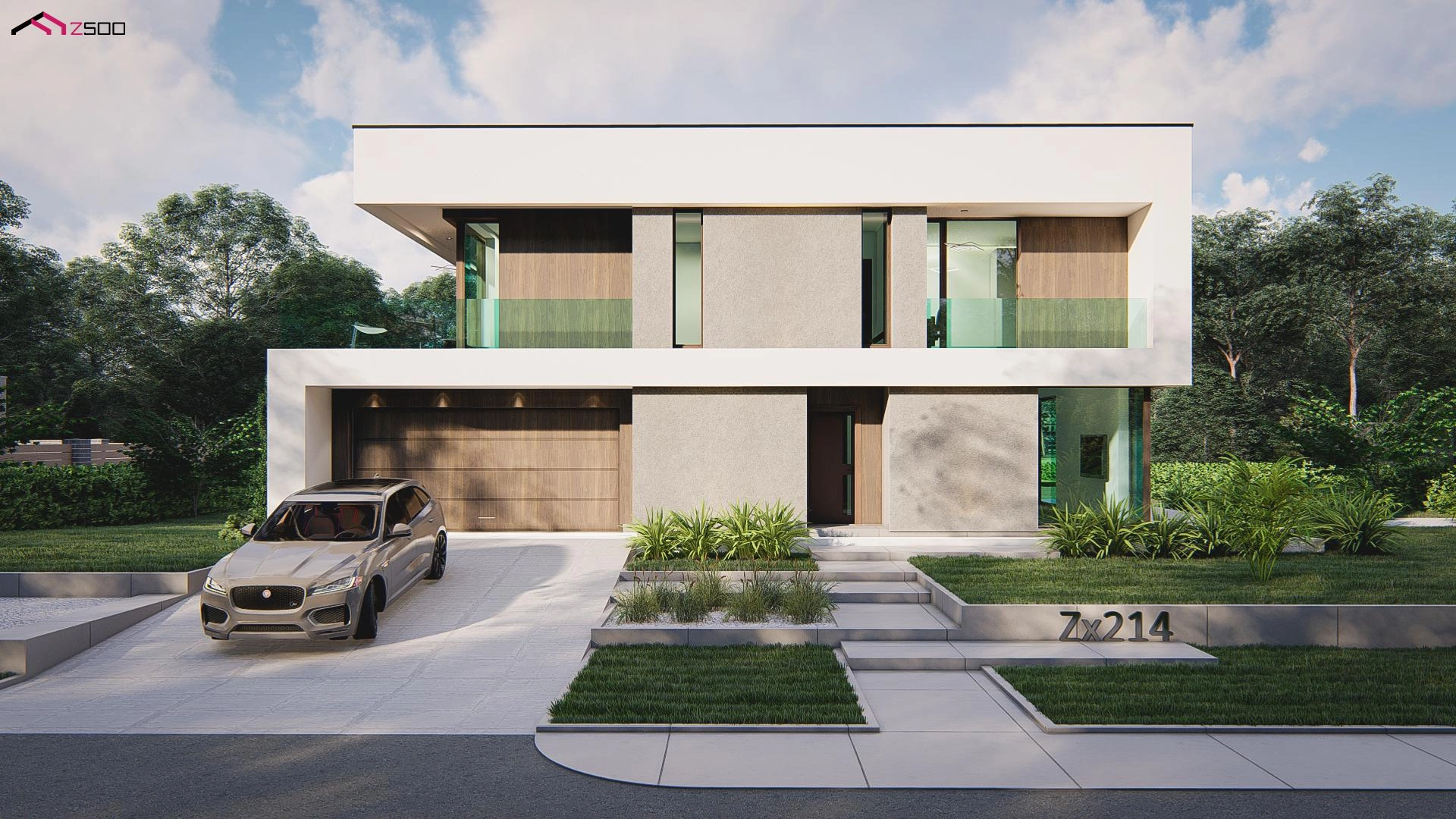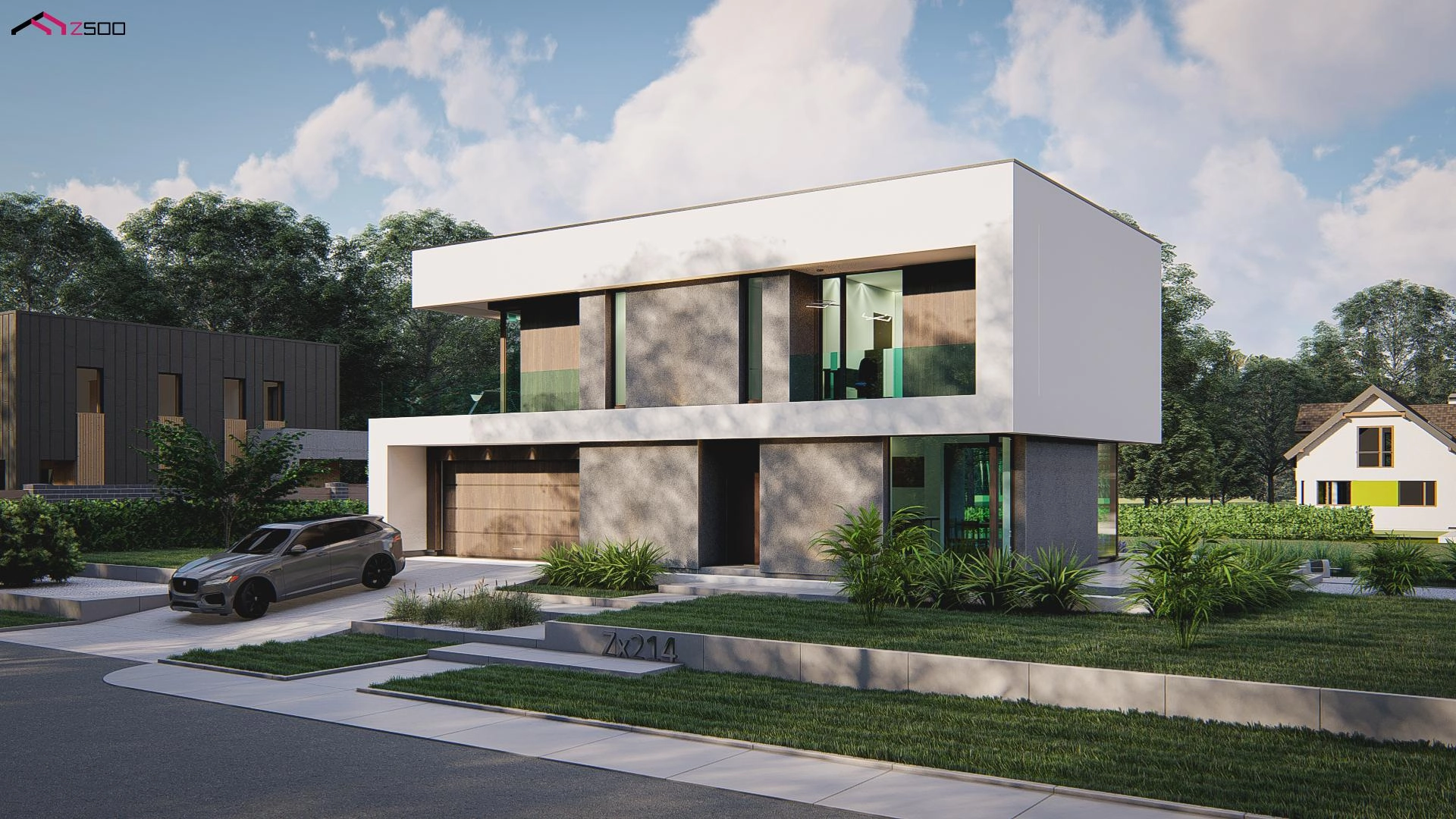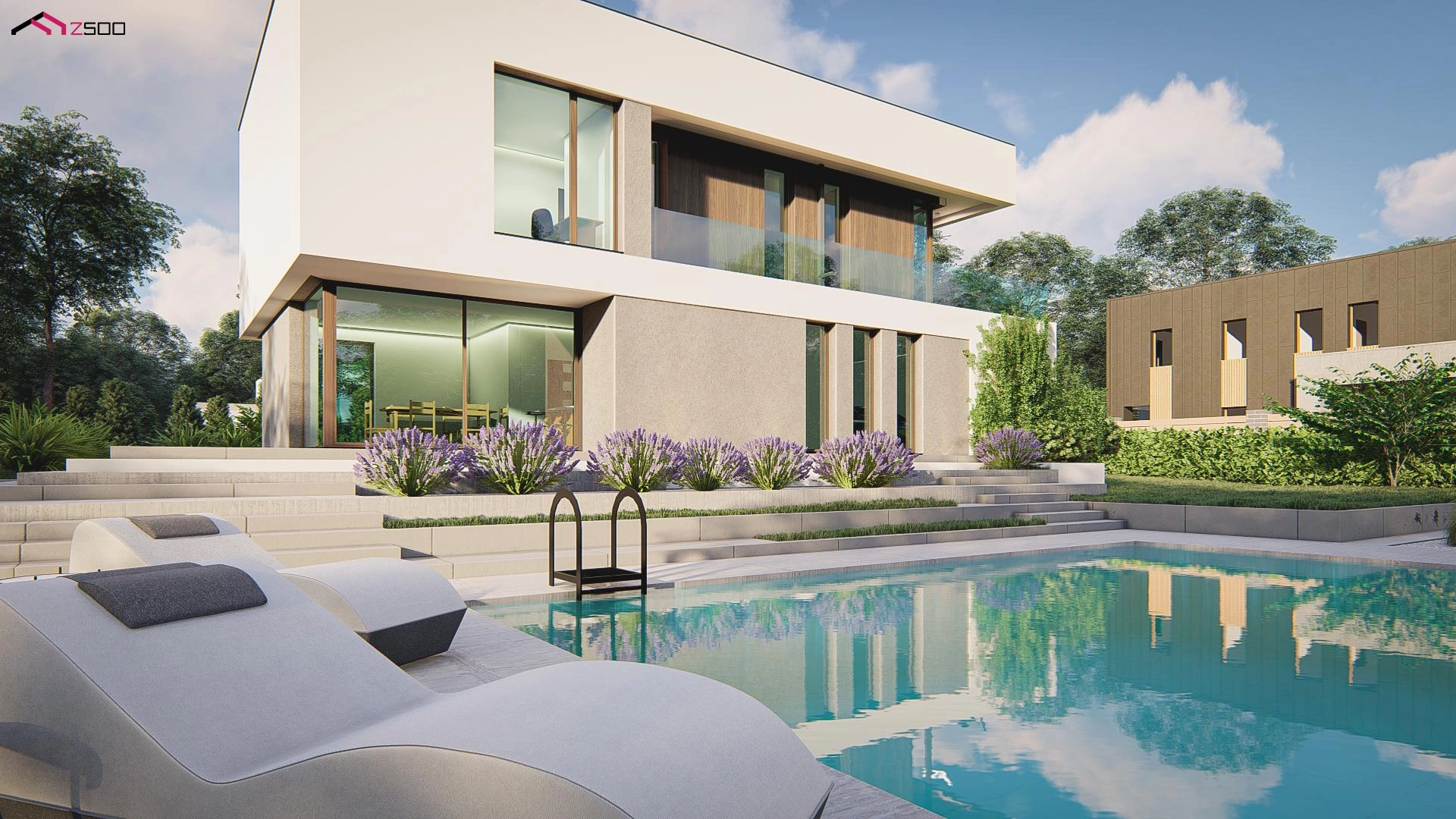 Innowacyjny projekt piętrowego domu skierowany jest dla osób ceniących elegancki, nowoczesny styl podkreślony licznymi przeszkleniami, dzięki którym otoczenie stanowi naturalne dopełnienie przestrzeni wnętrz. Prostokątna bryła wzbogacona została licznymi tarasami, co dodatkowo dodaje charakteru całemu budynkowi oraz idealnie komponuje się w jedną całość. Płaski dach tylko podkreśla jego nowoczesność. Zwarty plan domu o niewielkiej długości pozwala idealnie usytuować go również na wąskiej działce.